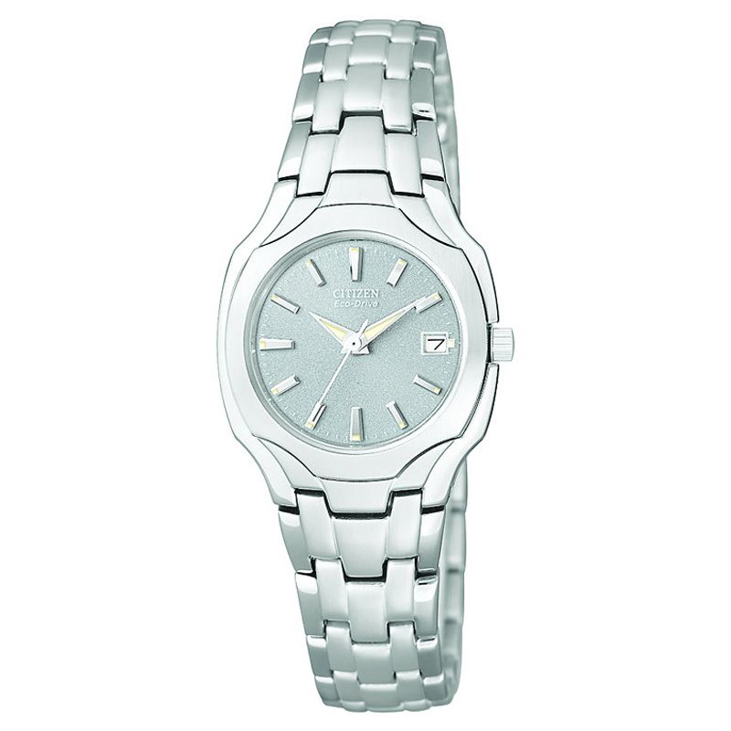 | Slip your wrist into this lovely eco-drive analog watch to keep elegant no-hassle track of your time Round silvertone case with gray calendar date display dial 3-hand movement and markers Water resistant Matching silvertone expansion band Fold over clip closure |